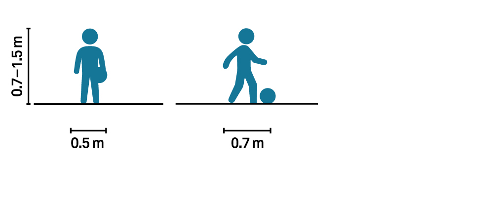 An alert adult who can see clearly, walk confidently in any environment, and react quickly to motor vehicles is the exception rather than the rule, and should not be used as the design case. Instead, select street attributes using a variety of “design pedestrians,” discussed in more detail below. All pedestrians benefit from shorter crossing distances, refuge areas, ample room to wait at intersections, intersection control that prioritizes their movement, and sidewalks that are laterally and vertically separate from all but the lowest-speed and lowest-volume traffic. Provide enough room on busy sidewalks for people walking in groups to pass each other. Use pedestrian countdown signals and minimize wait time while maximizing pedestrian signal phase length.