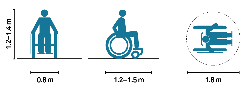 Integrate the needs of people who have impaired vision or hearing, people in wheelchairs, and those who walk with canes or gait trainers. Sidewalks must be wide enough to allow two people in wheelchairs to pass one another, with clear paths on low-volume streets being wider than 2 m and never less than 1.8 m. Clear paths should be unobstructed, level, and with a smooth surface. Design accessible ramps with shallow slopes at all crossings, preferably 8%, and provide cut-through paths in medians, pedestrian refuge islands, and corner islands.