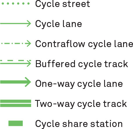 Provide clear wayfinding for cycles and signage for drivers to increase awareness among users. Indicate distances, directions, priorities, and zones shared with other users through ground markings and signage. Map the city’s cycle network and show route types. Tie cycle network developments with media campaigns and public events such as open streets or ride-to-work/school programs and promote cycle facilities. Signage and communication allow cyclists to better navigate the city and increase overall mode share.