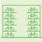 A cycle corral is a row of cycle racks placed on the street that occupies space in the parking lane. Existing parking spaces can be used efficiently as cycle parking, which helps free up space on the sidewalks. The cycle racks in the corral should be protected from parked cars by a plastic delineator or parking stops.