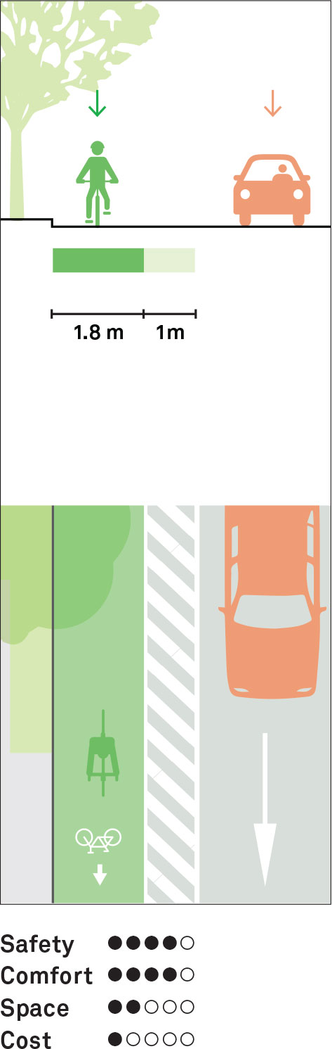 An exclusive clear path of at least 1.8 m provides a dedicated path with pavement markings and signage adjacent to the curb. An additional buffer space of a minimum of 1 m, and ideally 1.2 m, is marked between the cycle lane and the roadway. It is most applicable when speeds are below 40 km/h. As speeds or volumes increase, vertical separation increases safety and comfort. Cyclists remain visible to adjacent motorists and flexible bollards may be added in some cases.
