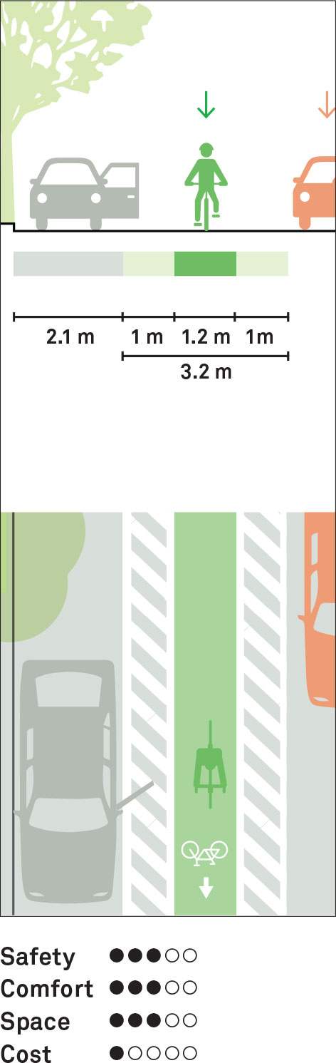 These are cycle lanes paired with a marked buffer separating the cycle lane from adjacent motor vehicles. A total cycle lane width of 3.2 m is recommended to provide adequate buffers between parked cars opening doors on one side and moving vehicles on the other.