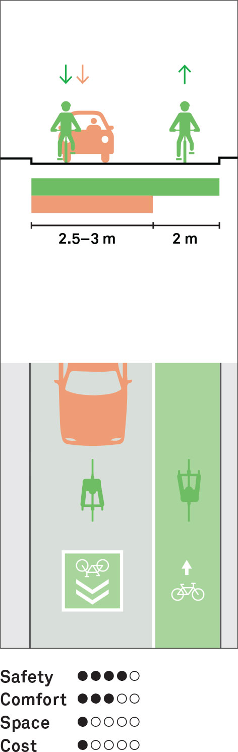 One-way cycle tracks are protected from vehicular traffic by a parking lane or a raised buffer. The track can be at road level, raised fully to sidewalk level, or partially raised with an intermediate mountable curb. Provide 2 m cycle lanes for cyclists to pass one another and a 1 m minimum buffer to reduce the risk of conflict with vehicle doors being opened in parking-protected cycle tracks.