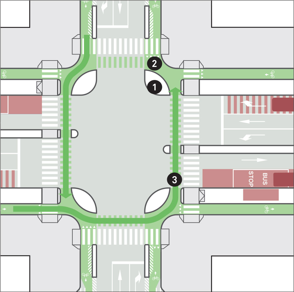 The protected intersection continues the physical separation of cycle facilities, positioning cyclists prominently ahead of right-turn conflicts and creating safe, simple cyclist movements through intersections. This can be achieved without moving existing curbs, with modifications making the intersection more compact and organized.