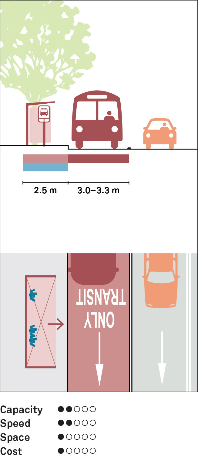 Placing a transitway in an exclusive space separated by vertical elements such as medians improves travel times and predictable movement by reducing conflicts with parked cars, cycles, and some turning movements. Side-running transitways are applicable for highfrequency transit service, especially bidirectional service where turns and curb cuts across the transitway are very limited. To avoid conflicts with transit vehicles, left- and right-turning traffic must be prohibited or accommodated using turn lanes with dedicated signal phases. Widths of 3.3–3.5 m are recommended, as are complementary elements such as all-door boarding, transit signal priority, and level boarding.