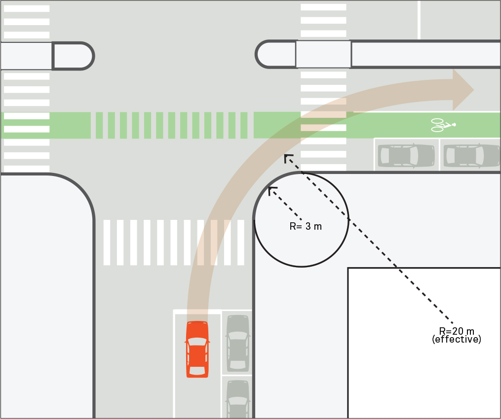 Corner radii directly impact vehicle turning speeds and pedestrian crossing distances. Minimizing the size of a corner radius is critical to creating compact intersections with safe turning speeds. While standard corner radii are 3–5 m, in urban settings, smaller corner radii of 1.5 m are preferred and corner radii exceeding 5 m should be the exception.
