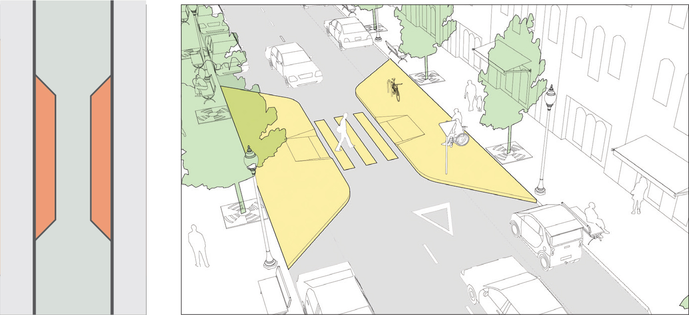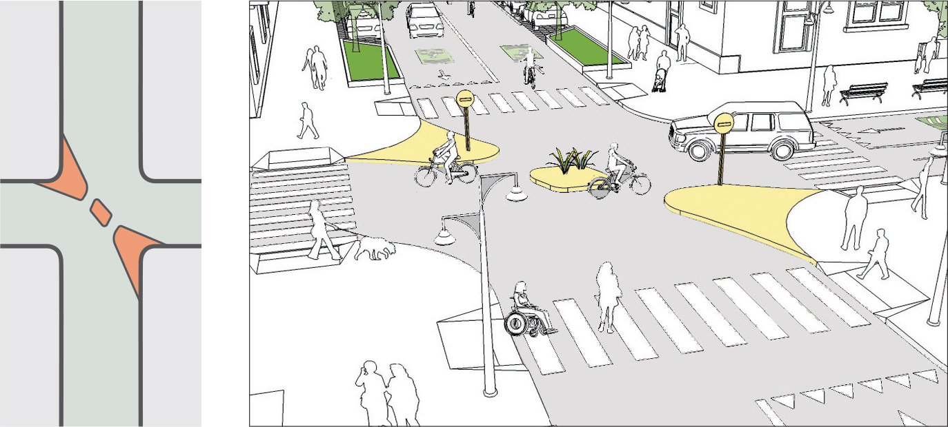 Narrowing corner radii reduce vehicle turning speeds as well as pedestrian crossing distances. Minimizing the size of a corner radius is critical to creating safe and compact intersections. See: Corner Radii.