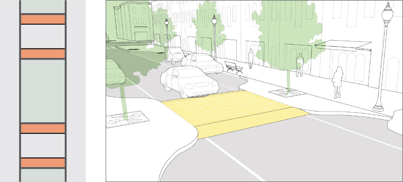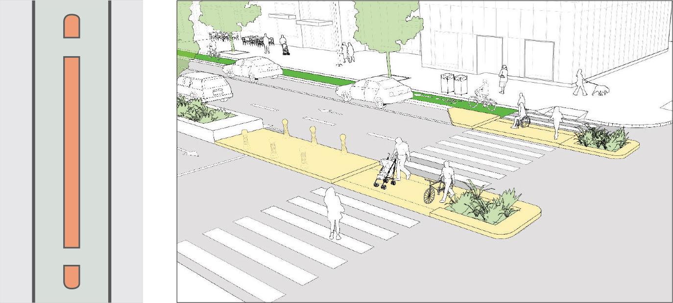 Pinchpoints narrow the roadway at a mid-block point. They can be combined with speed tables to create high-quality pedestrian crossings. They can also be used on low-volume, two-way streets to require facing motorists to yield to one another. See: Sidewalk Extensions.