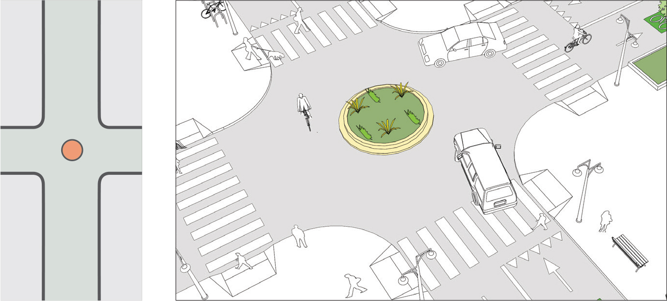 Mini roundabouts are round islands at intersections that serve to both reduce speeds and organize traffic, routing vehicles around the island rather than directly across the intersection. See: Mini Roundabout.