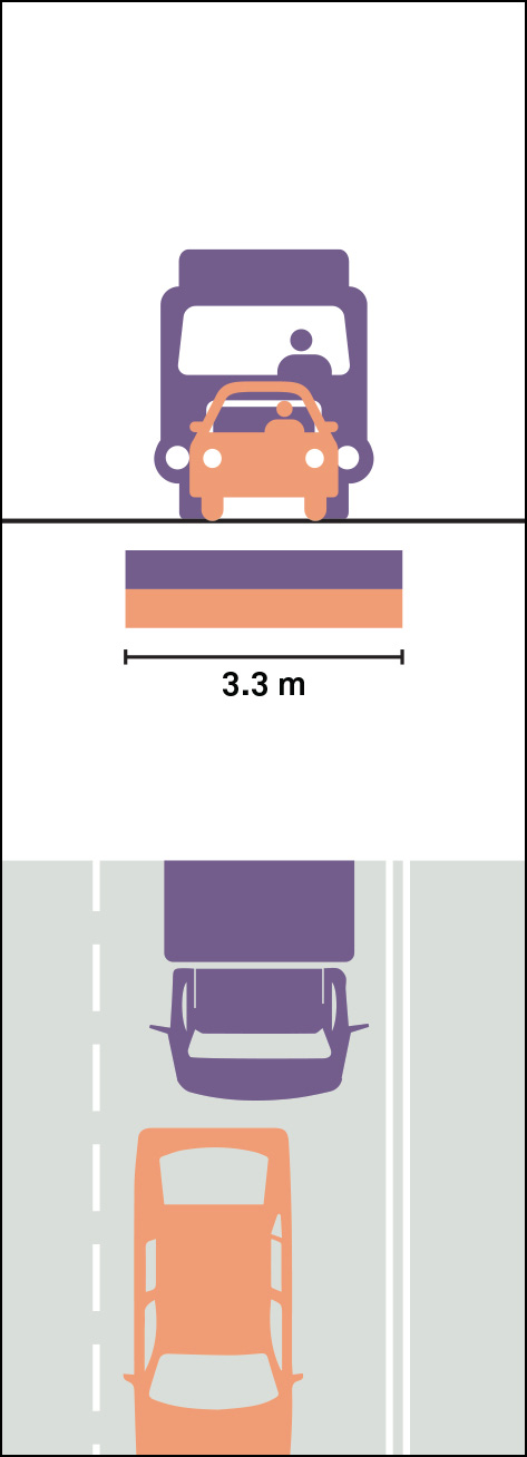 The recommended width for travel lanes on routes that allow trucks and large vehicles is 3.3 m, and any allowable truck routes or restrictions should be clearly marked. Use freight vehicles as the design vehicle to set widths and corner radii only on primary freight corridors. On smaller local routes where freight access is needed, use smaller vehicles as the control vehicle.