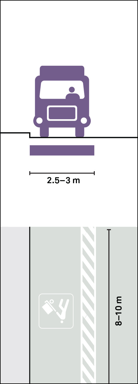 Loading bays facilitate the efficient pick-up and drop-off of goods to and from local businesses. These should be located away from intersections to reduce conflicts and in areas where their services will not block sidewalks or cycle lanes. Loading bays should be strategically located to complement other urban street activities, and their use can be limited to certain times. Time restrictions should apply in high-volume pedestrian areas.