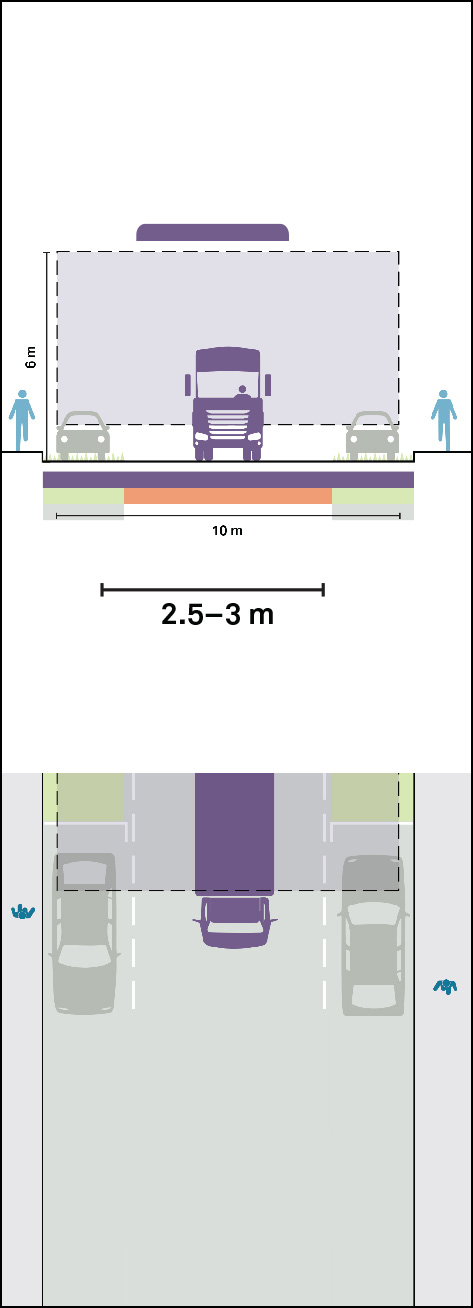 Routes that allow oversized vehicles carrying wide loads, such as prefabricated materials or large construction machinery, should be able to accommodate loads that fit within an envelope of 10 m wide and 6 m high. These should be strategically located to allow transfer points for goods to narrower contexts, should be limited to off-peak hours, and assume projection over low streetscape elements such as planters and curb extensions to achieve required clear paths.