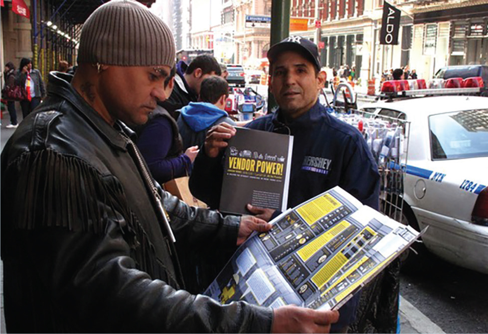 Street vendors in New York City reading the Street Vendor Guide