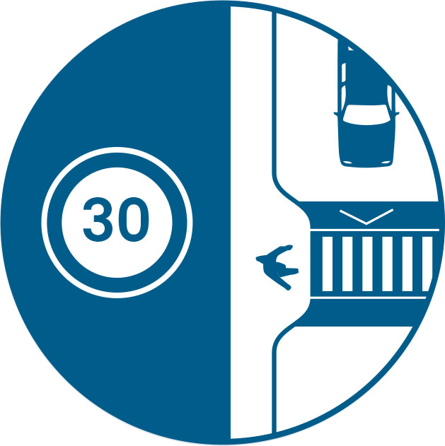 Ensure safe design speeds through narrow travel lanes, tight corner radii, and other speed reduction measures that help reduce exposure and risk for vulnerable users. See: Traffic Calming Strategies, Operational and Management Strategies and Design Controls.