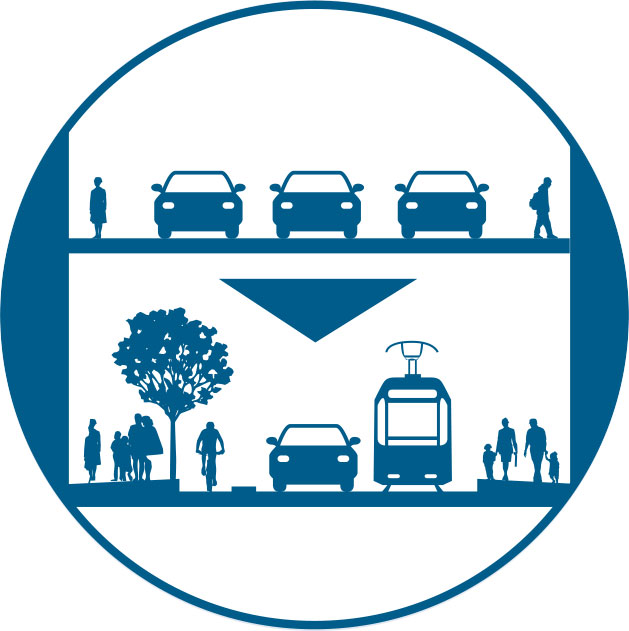 Change geometries to prioritize active and sustainable mobility choices. Provide dedicated facilities that prioritize pedestrians, cyclists, and collective transport use. See: Designing Streets for People.