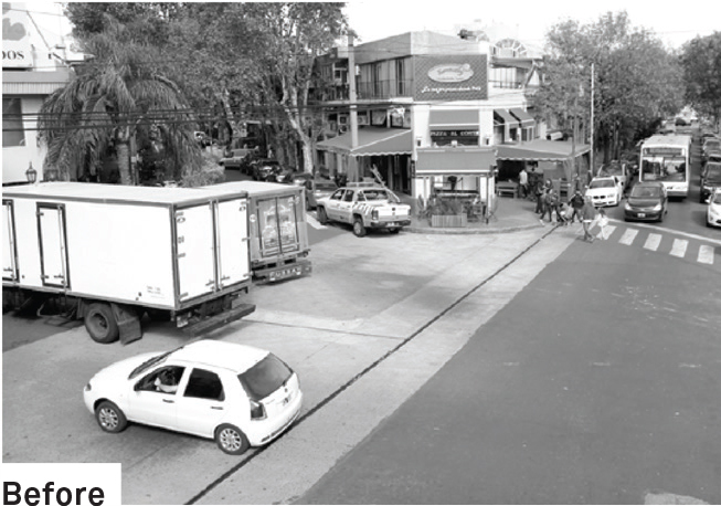 Corners and other areas of a plaza that are subject to encroachment or turning vehicles should be reinforced using heavy objects such as planters and bollards that alert drivers to the new curb line.