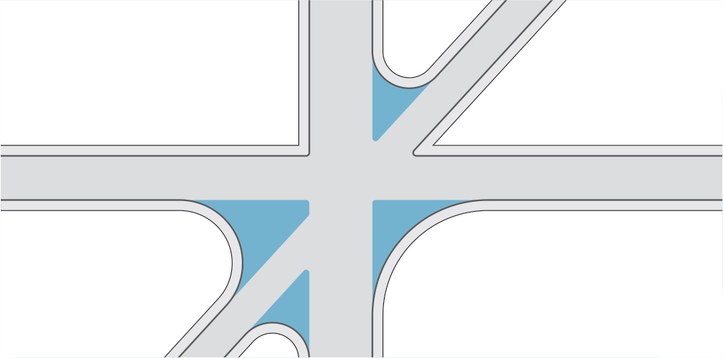 Complex geometry creates large tracts of underutilized pavement, further degrading conditions of safety and comfort.