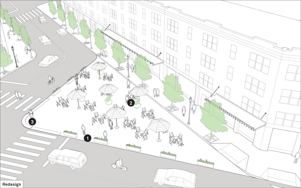 Plazas transform and activate underutilized street segments and provide relief where pedestrian demand is unmet and foot traffic overflows into the roadway. They make the roadway and intersections more compact, and easier for pedestrians to cross.