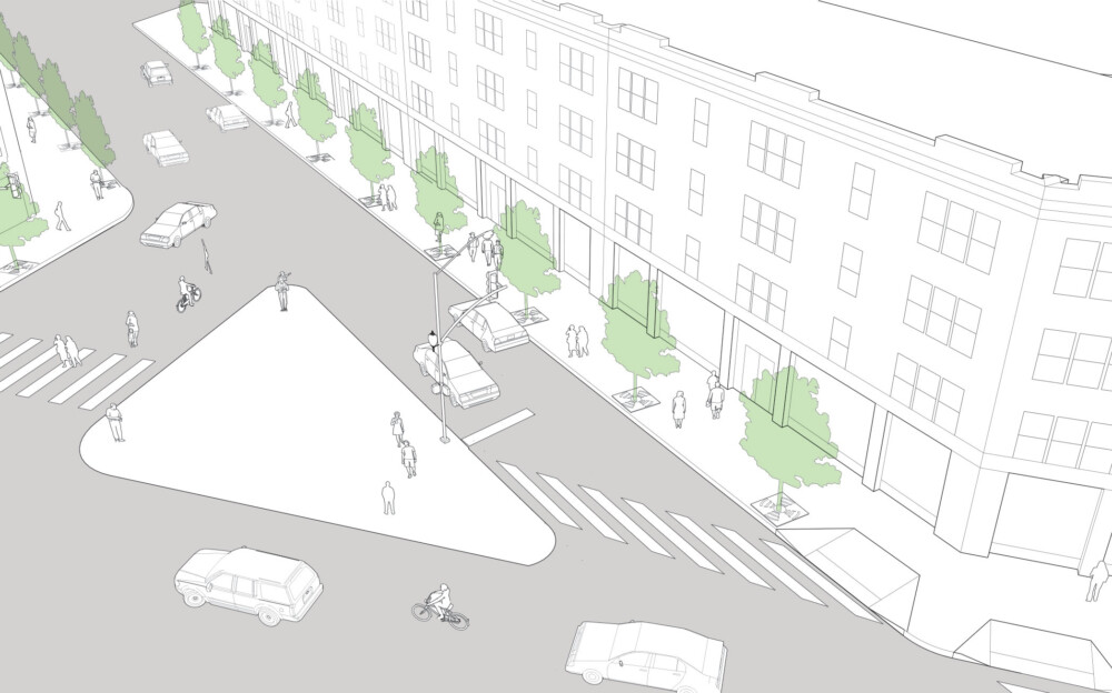 These plazas provide additional pedestrian space by redesigning intersections to be more compact. Using residual space between intersecting streets, on street corners and traffic islands, these spaces provide a safer and more active pedestrian environment. They are characterized by smaller sizes and angular shapes. These plazas may contain bollards for protection from vehicles, street signage, and cycle-share facilities. This configuration reduces pedestrian crossing distances and slows traffic.
