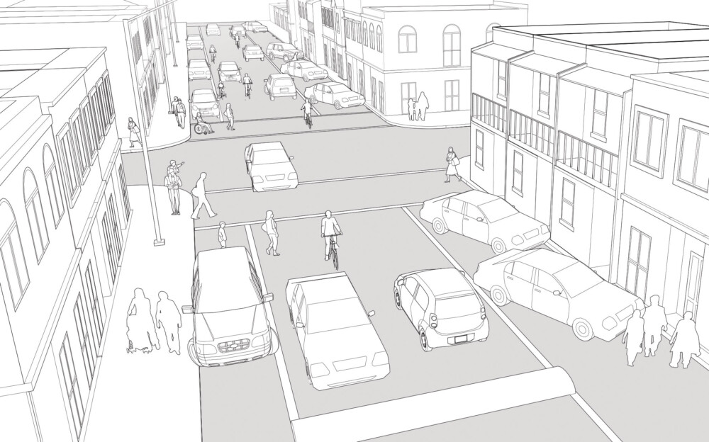 Alternate curb extensions and rain gardens with parking spaces to create pinchpoints on the streets, which help in speed reduction.