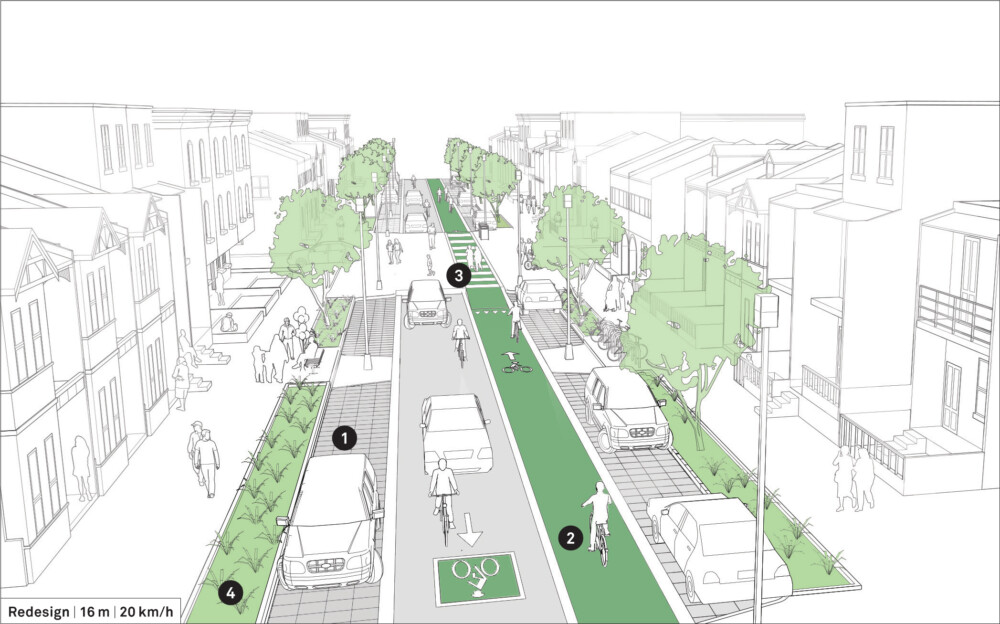 Traffic calming strategies slow vehicular speeds to 20 km/h, ensuring a safe environment for pedestrians, cyclists, and motorists. Add speed tables at the intersections to facilitate raised crossings and prioritize pedestrians.