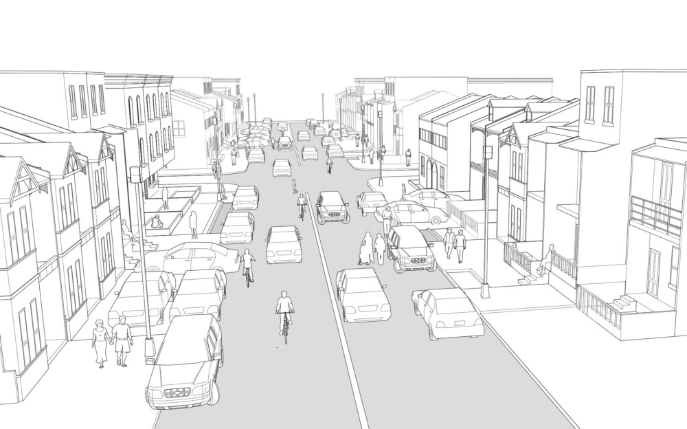 Transform the street by removing one travel lane, improving sidewalks, and adding a contraflow cycle lane.