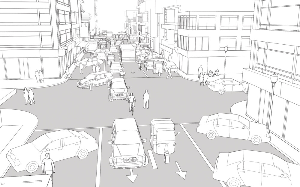 This example illustrates a main street with two travel lanes in the same direction and unregulated parking on both sides.