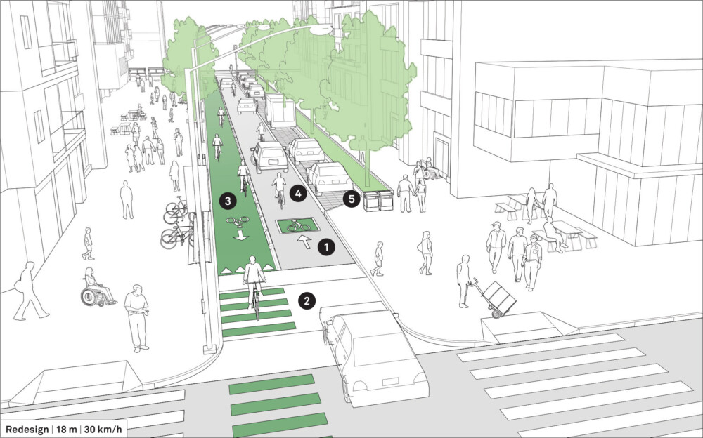 Reduce travel lane width to 3 m in order to avoid speeding. Add raised crossings at intersections to prioritize pedestrians and ensure slow traffic speed. See: Traffic Calming Strategies.
