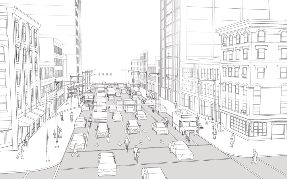 This illustration depicts a large one-way street in the center of the city that coexists with a highly active mix of land uses.