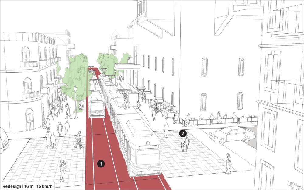Restrict all vehicular access. Add accessible and grade-level, center running mass transit to give the street a shared quality and to ensure pedestrian priority.