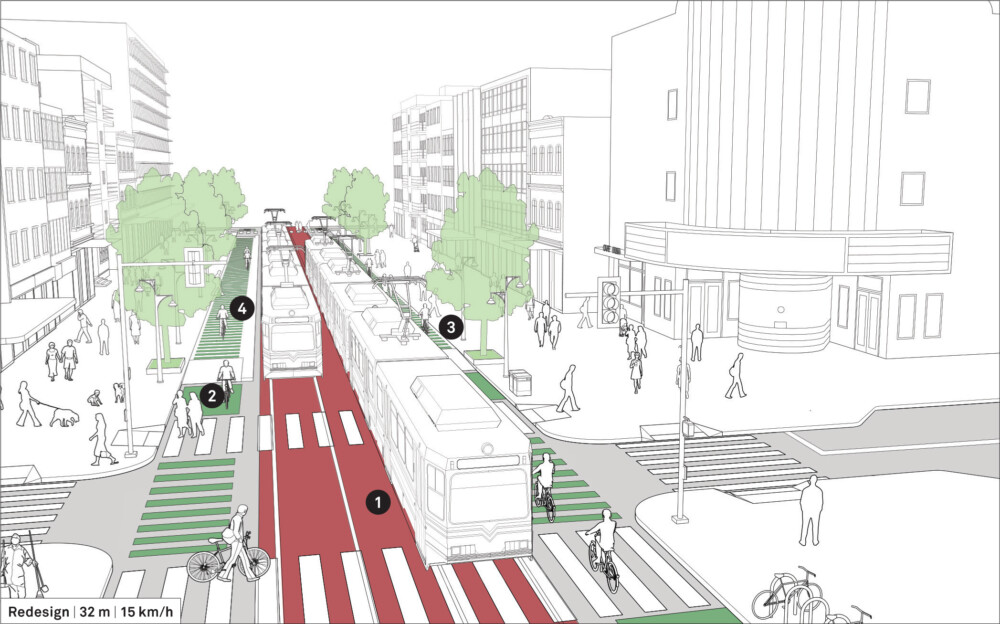 The street illustrated above plays an important role in the city’s network, connecting commercial hubs to neighborhoods with a center-running transit spine. At times, transit is physically separated to increase efficiency.