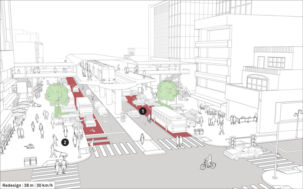 The street is redesigned to prioritize transit and shared mobility, improve walking conditions and public space, and transform key transfer nodes into recognizable landmarks.