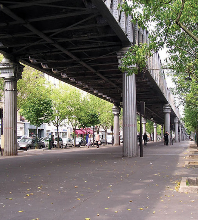 Utilities and elevated transit infrastructure often block clear pedestrian paths and limit visibility.