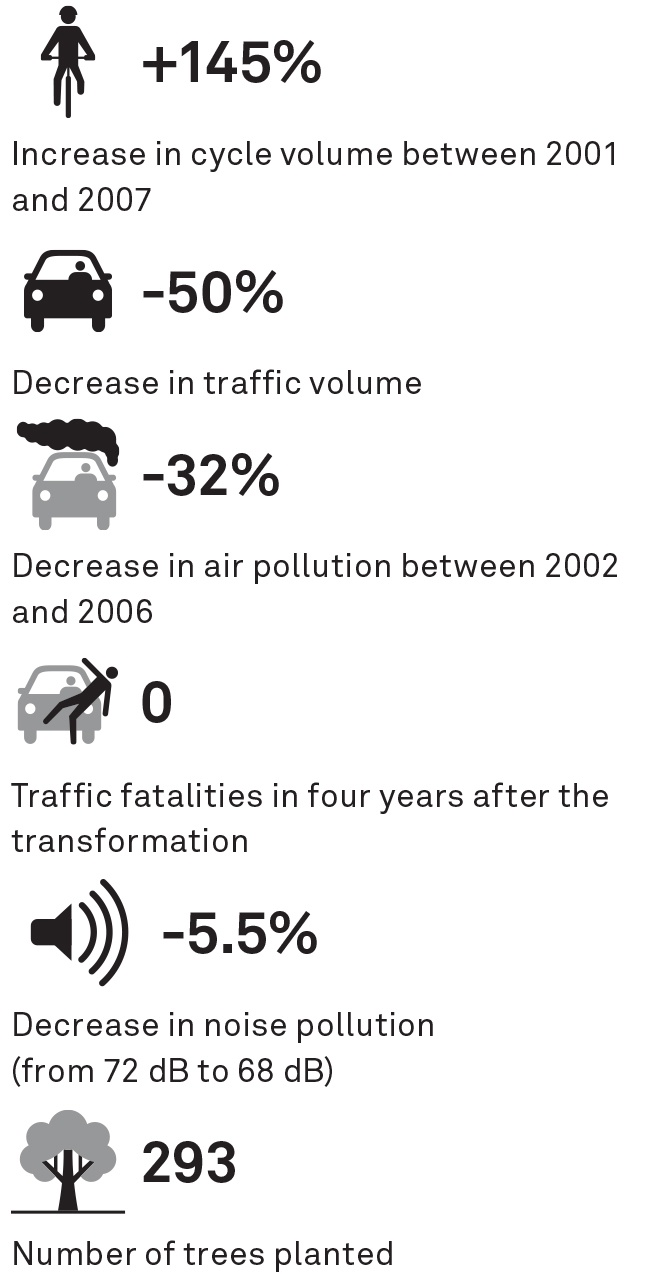 Under the program, €24 million were invested in widening sidewalks, planting trees, and building protected cycle tracks. Granite dividers were installed to protect a new dedicated bus lane.