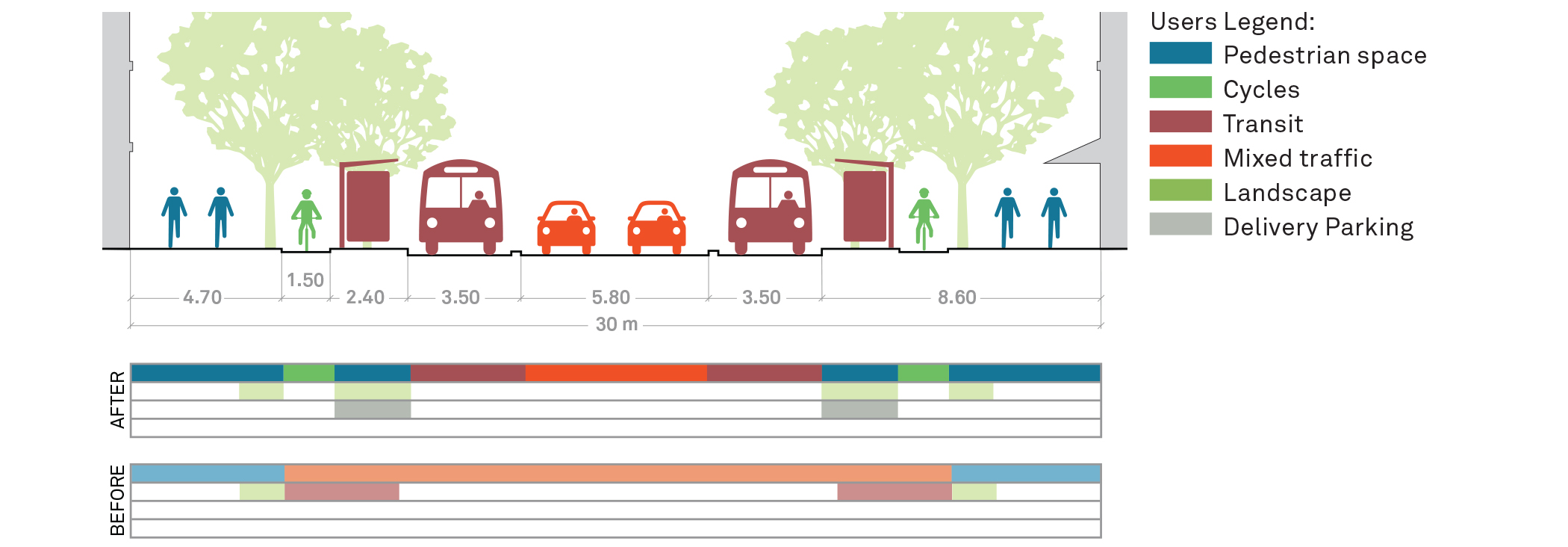 To accommodate deliveries, 30-minute truck parking spaces were located on the curbside of the dedicated bus lane.