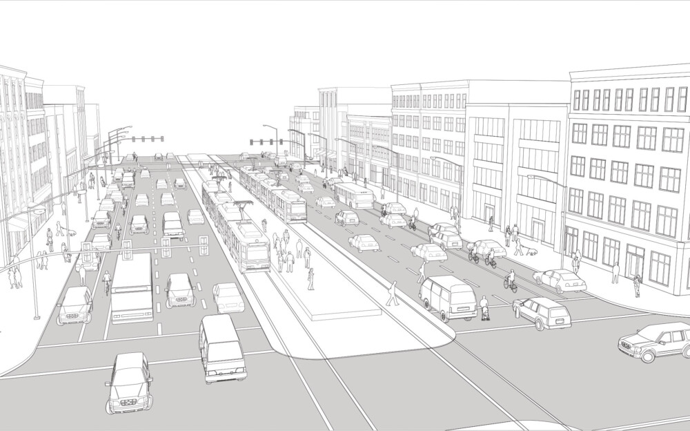 The illustration above depicts a major street with center-running transit and unprotected cycle lanes. It serves as an arterial corridor with three wide lanes for fast-moving traffic in each direction. This street connects the city across multiple neighborhoods and regionally.