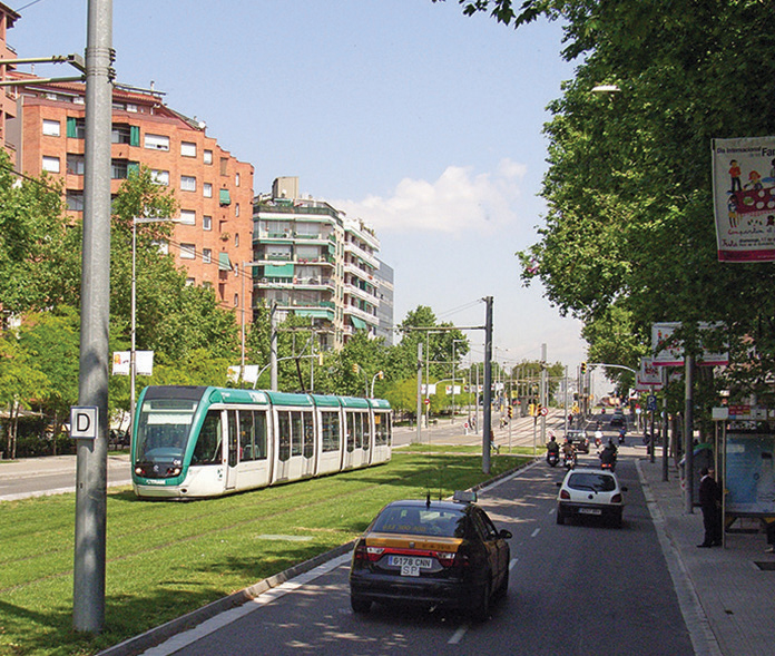 Install street trees and green infrastructure along parking-side medians to dissipate road noise, manage stormwater run-off, and improve the urban environment.