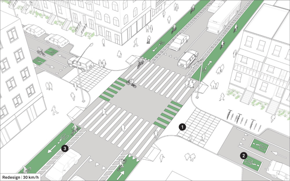 Introduce shared-lane markings and advanced stop boxes to prioritize cyclists at the intersection. A maximum speed of 30 km/h is recommended on the residential street and the use of traffic calming measures is encouraged.