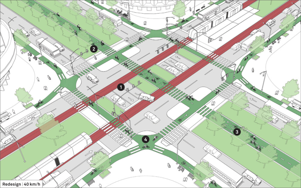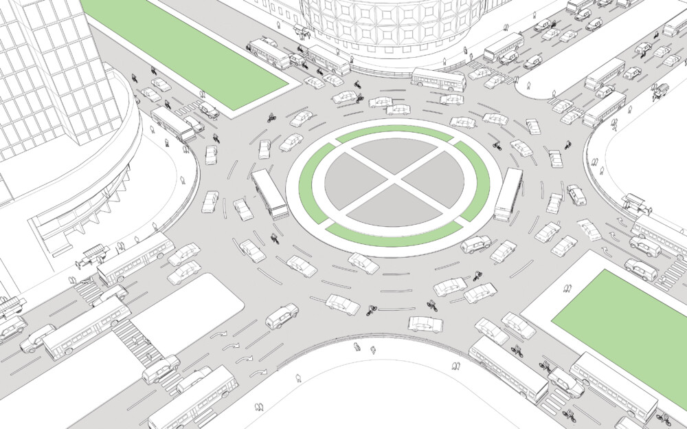 This reconstructions shows the transformation of a roundabout into an orthogonal configuration with signalized traffic control and a more balanced allocation of space between different modes.