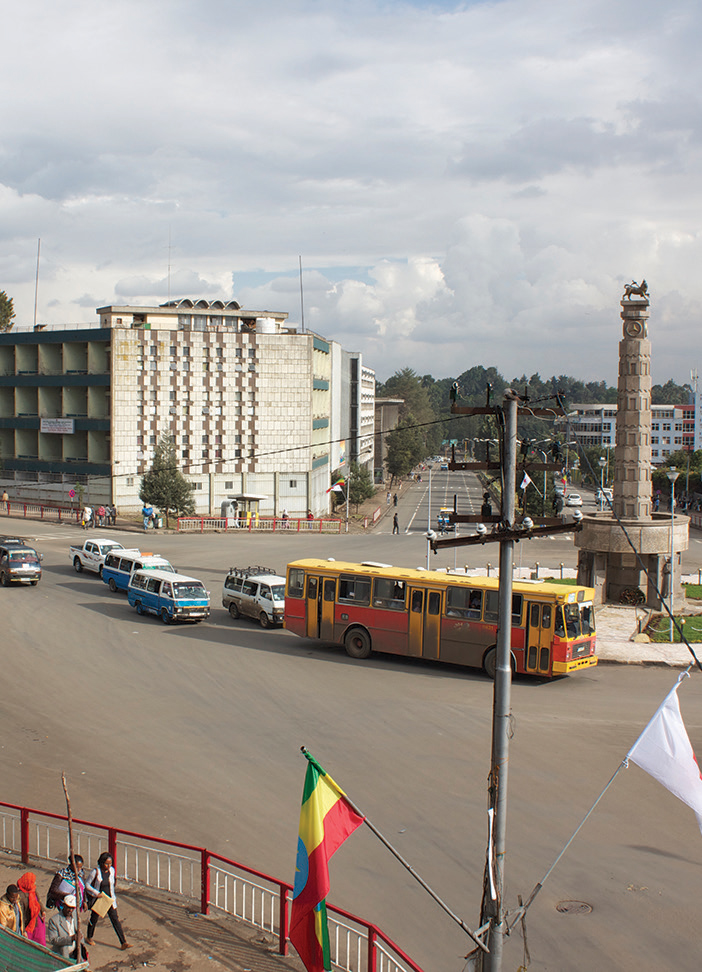 Addis Ababa, Ethiopia. A very wide traffic circle where the central space is naccessible. Pedestrians have to cover very long distances in order to cross the street due to the wide diameter of the traffic circle. Sites like this present a great opportunity for redesign.