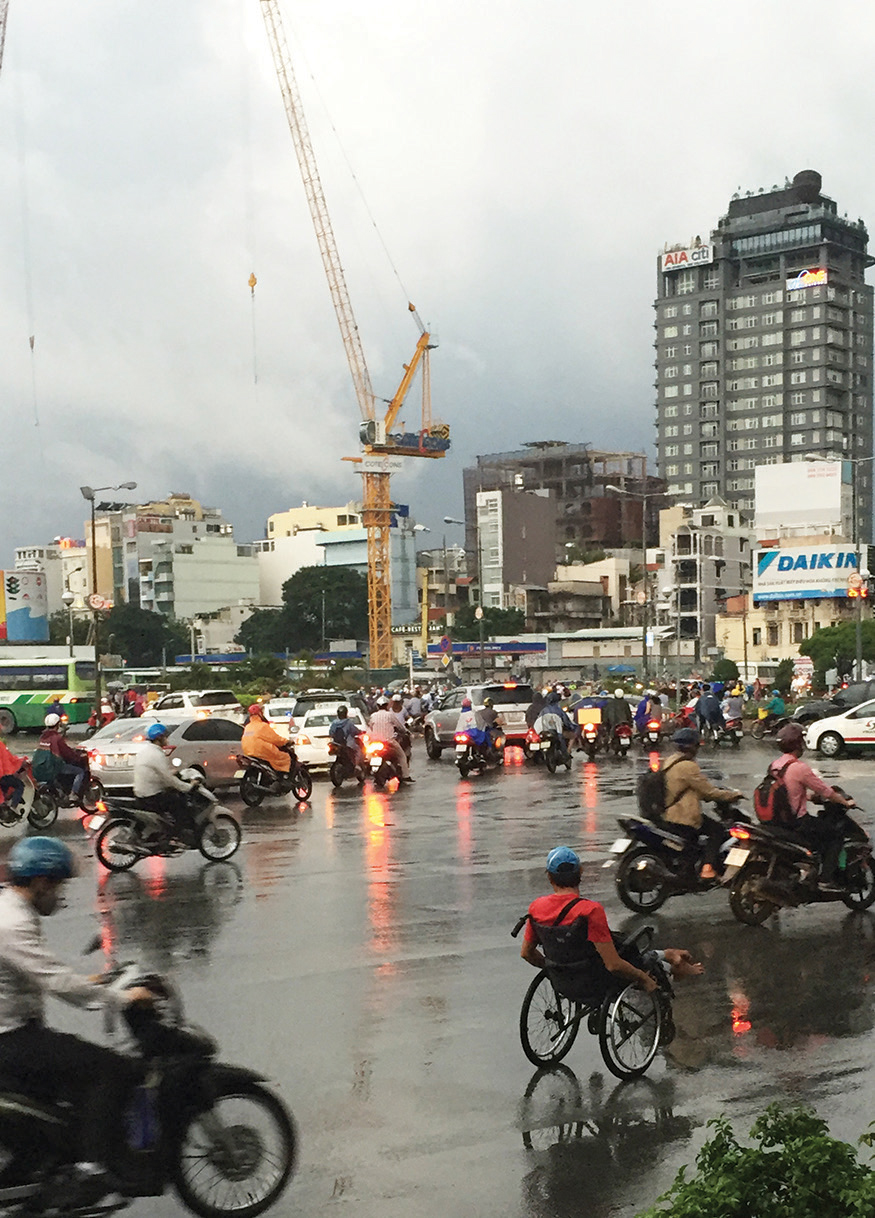 Ho Chi Minh City, Vietnam. A vulnerable user in a wheel chair tries to cross the street at a busy roundabout with no pedestrian crossings.