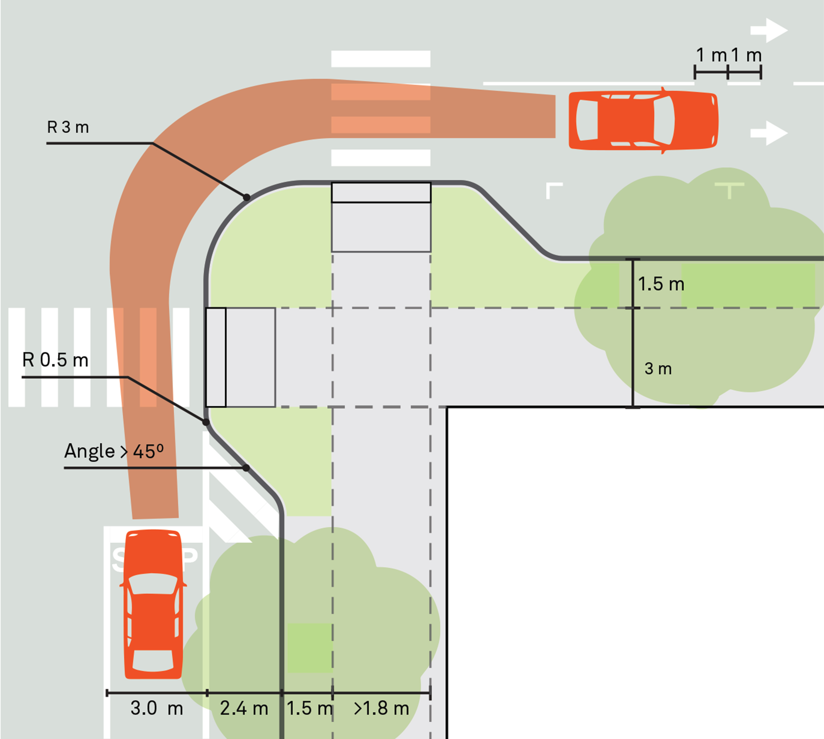 Minimize corner radii to slow turning vehicles, keep intersections compact, and ensure safe, pedestrian-friendly spaces. Corner radii in urban areas can be as small as 0.6 m.